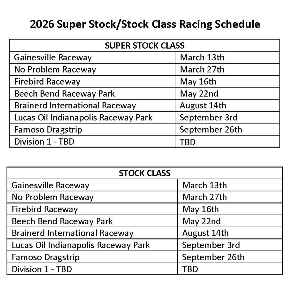 The Super Stock/Stock Class Racing schedule will include races at Gainesville Raceway on March 13, No Problem Raceway on March 27, Firebird Raceway on May 16, Beech Bend Raceway Park on May 22, Brainerd International Raceway on Aug. 14, Indianapolis, Famoso Dragstrip on Sept. 26 and Maple Grove Raceway on Oct. 23.